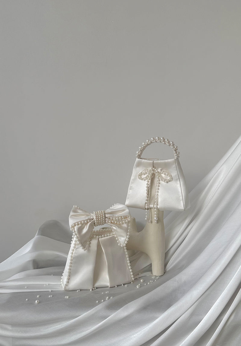 Meet the all new ‘Fae’ bag: an elevated and chic alternative to the traditional ‘potli’, this bag features an inverted box pleat along and a statement bow made with strings of pearls. It also features a beaded handle and is the perfect poetic expression of modern femininity.