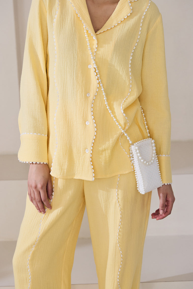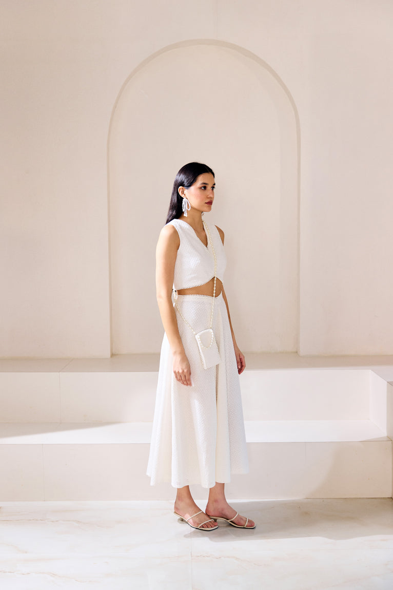 Meet our newest bag – featuring pearl handles and a long pearl strap, this phone bag in cotton eyelet fabric is the perfect playful expression of modern femininity. Instantly dress up any look with this accessory that is not only functional but also so chic.