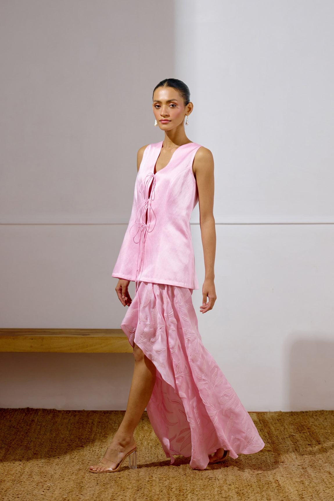 Our beloved wave neckline tie-up top gets a polished update – paired with an embroidered draped skirt in buttery satin organza, this dressed up version is ideal for late summer soirees as well as effortlessly chic holiday moments.