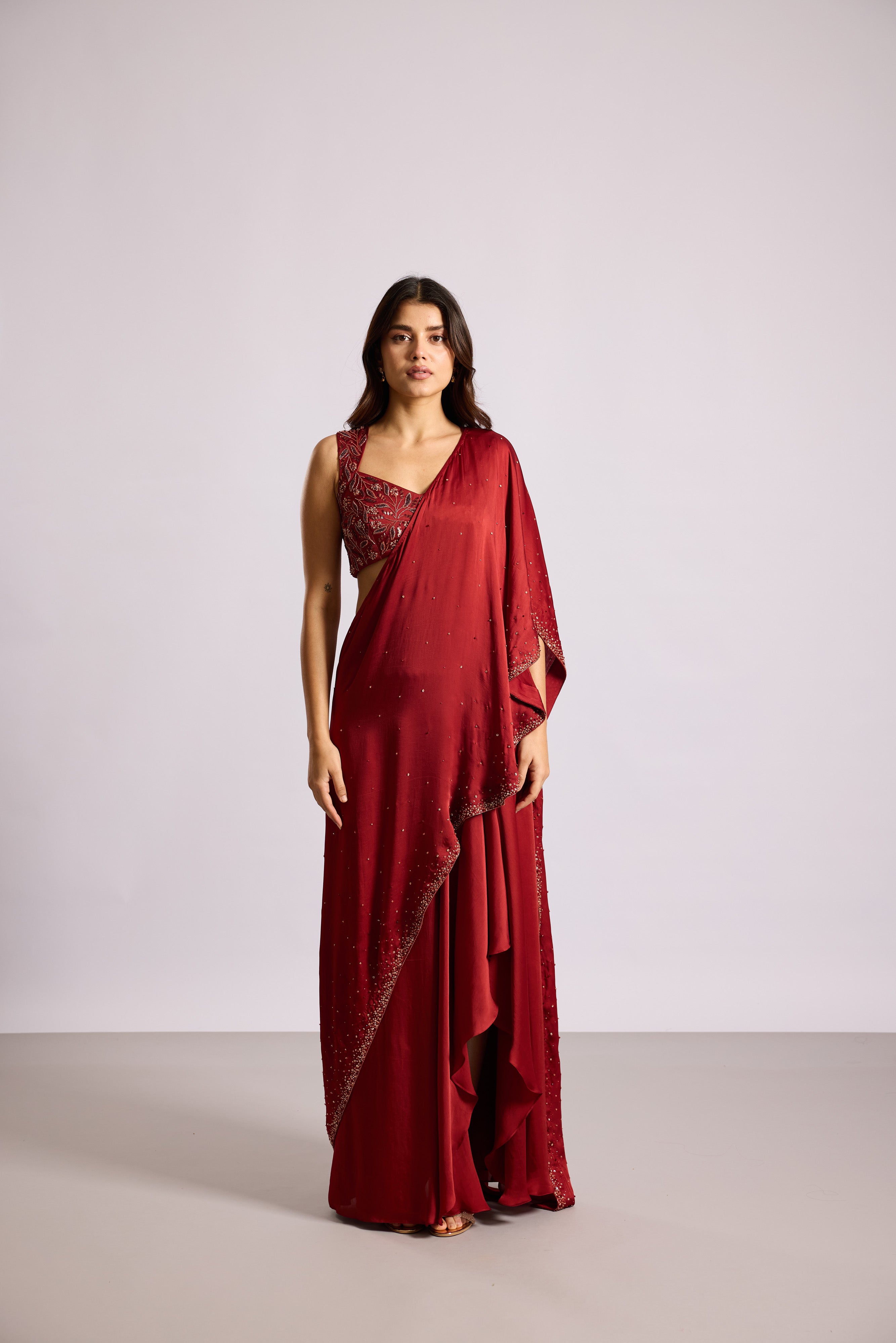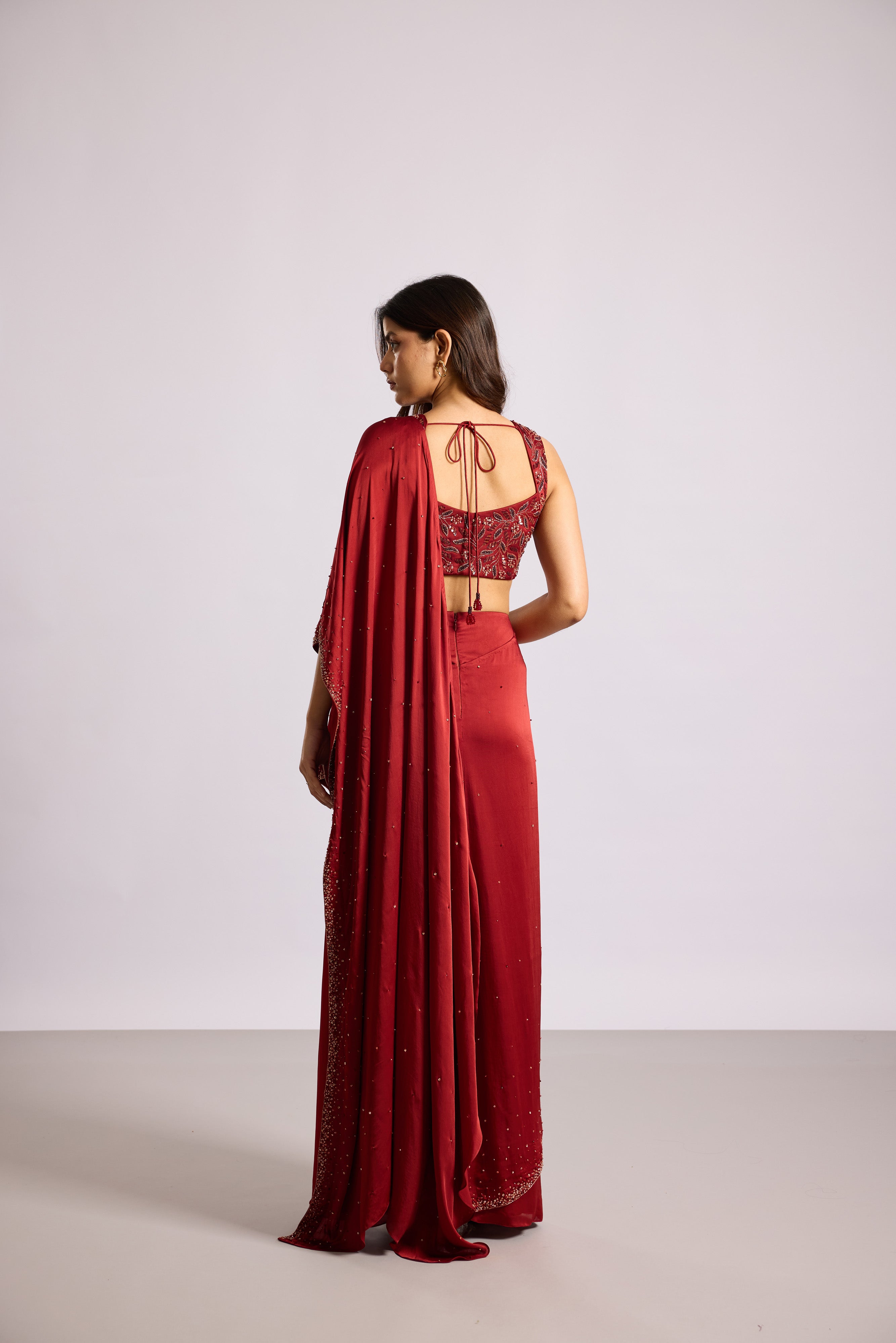 Our newest interpretation on the quintessential draped saree: draped skirt with an attached saree drape hand embroiderd with sequins, crystals and beads.