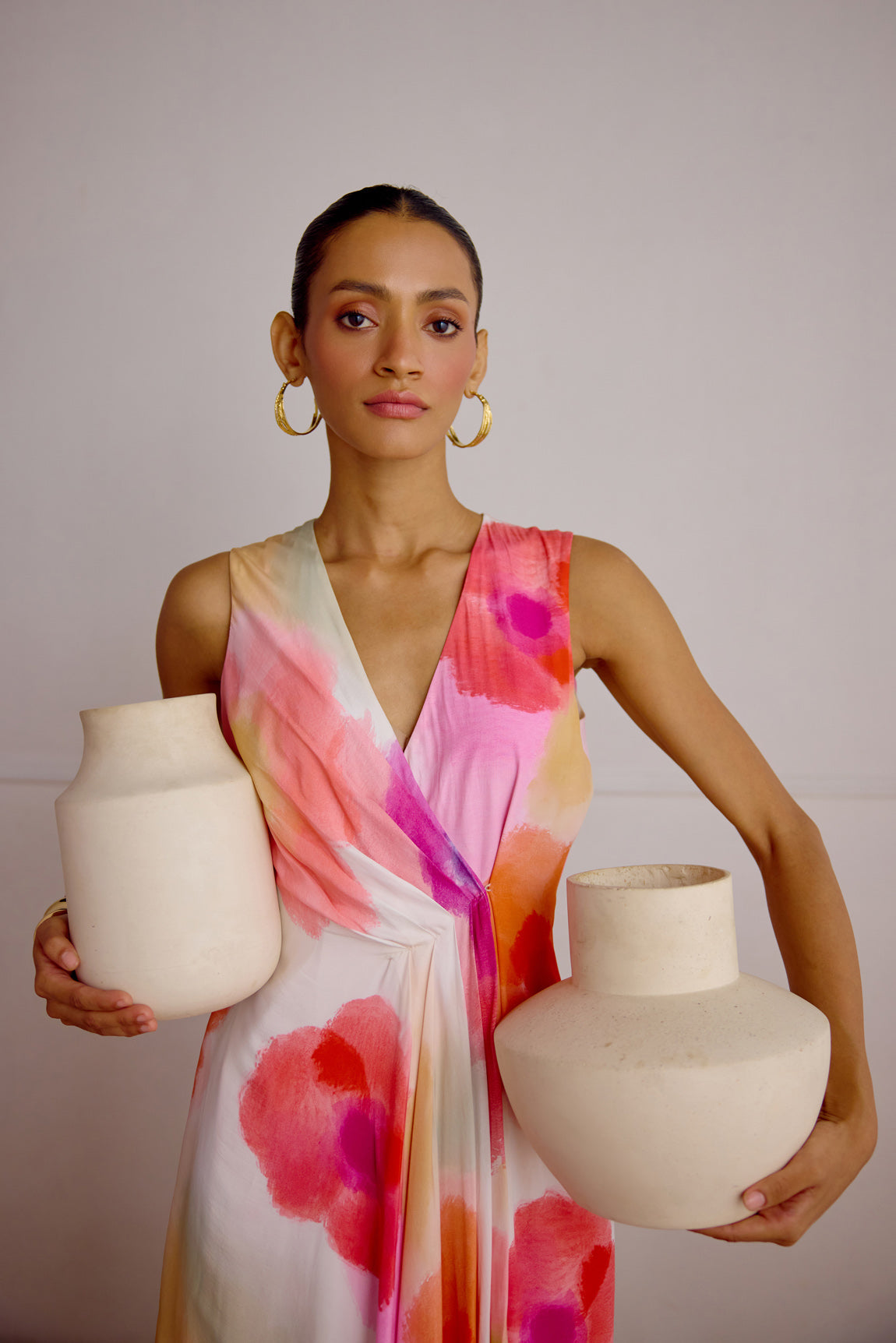 Sleeveless draped wrap dress in our all new Aperol Print–ideal for late summer soirees as well as vibrant vacation days.