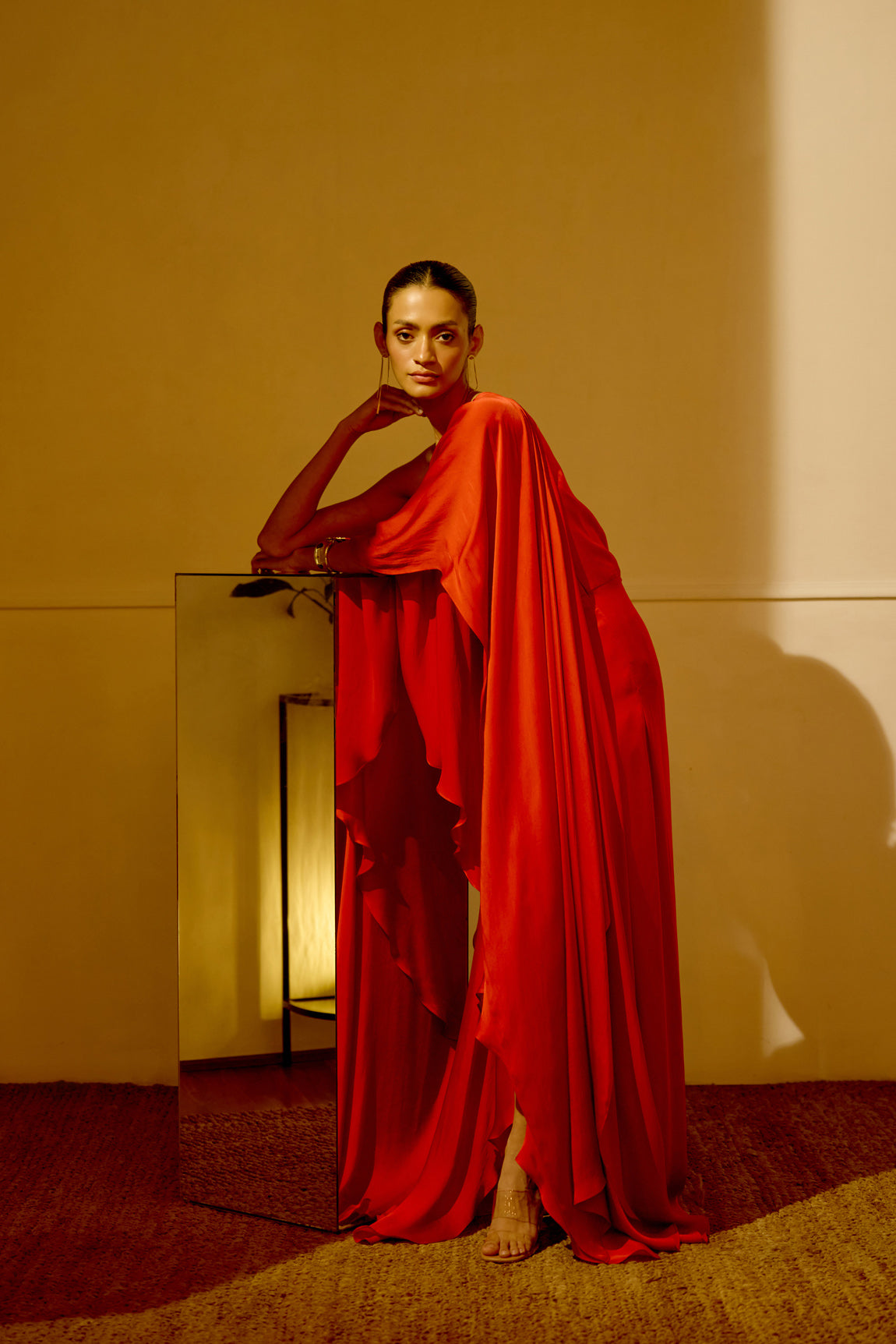 Our take on destinaton wedding dressing: Floor-length one-shoulder draped dress with an attached saree-like drape–a standout piece for late summer soirees and dressed up Indian occasions alike.