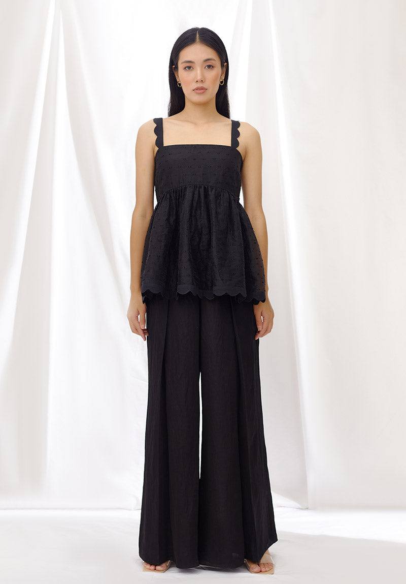 This top features a fitted bodice with a full gathered peplum in dotted organza. It is finished with our signature scallop straps and border.