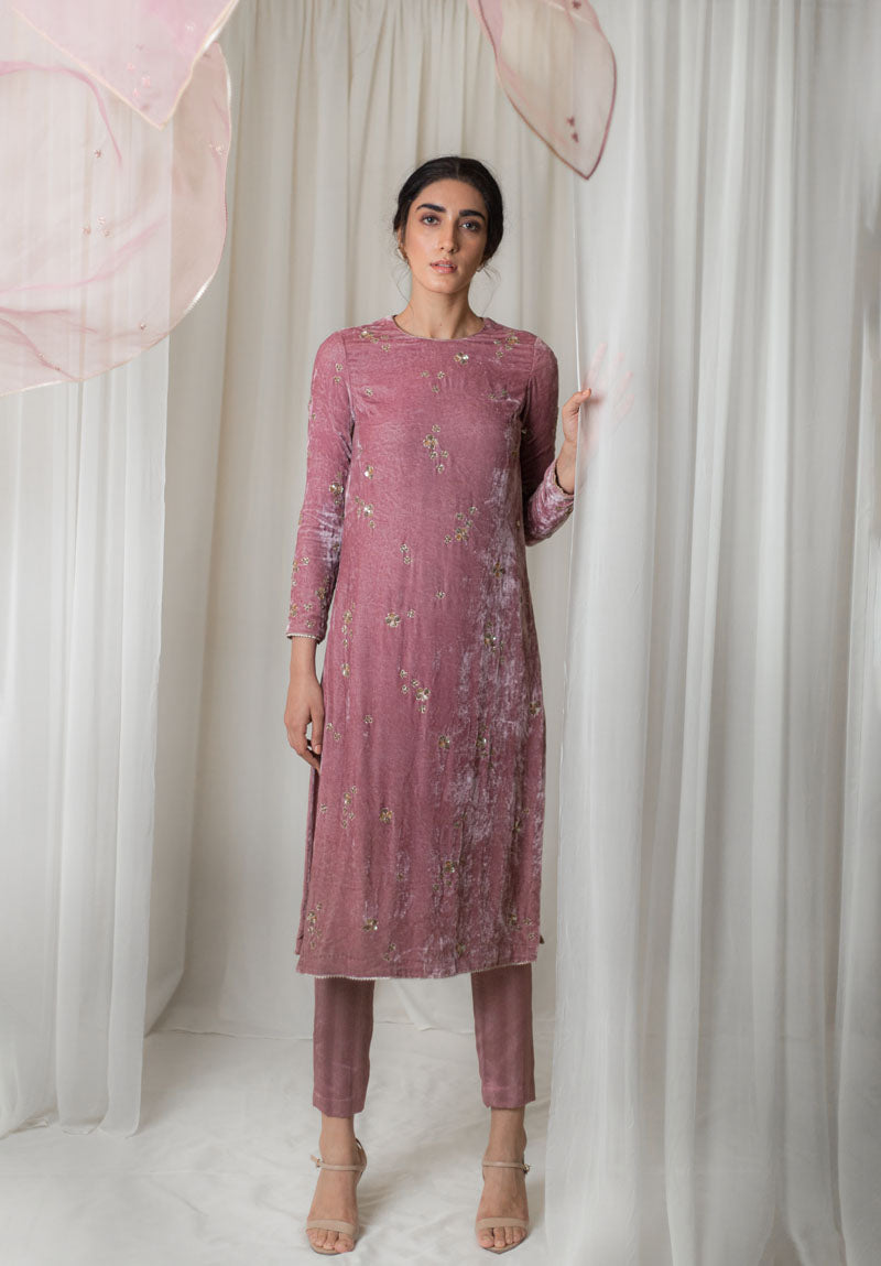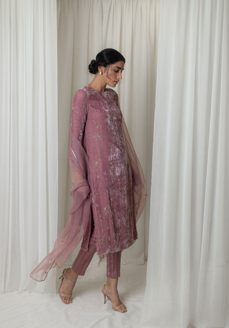 This set features a long embroidered velvet kurta with high sid-slits. It is paired with cigarette pants and a lightly embellished silk organza dupatta.