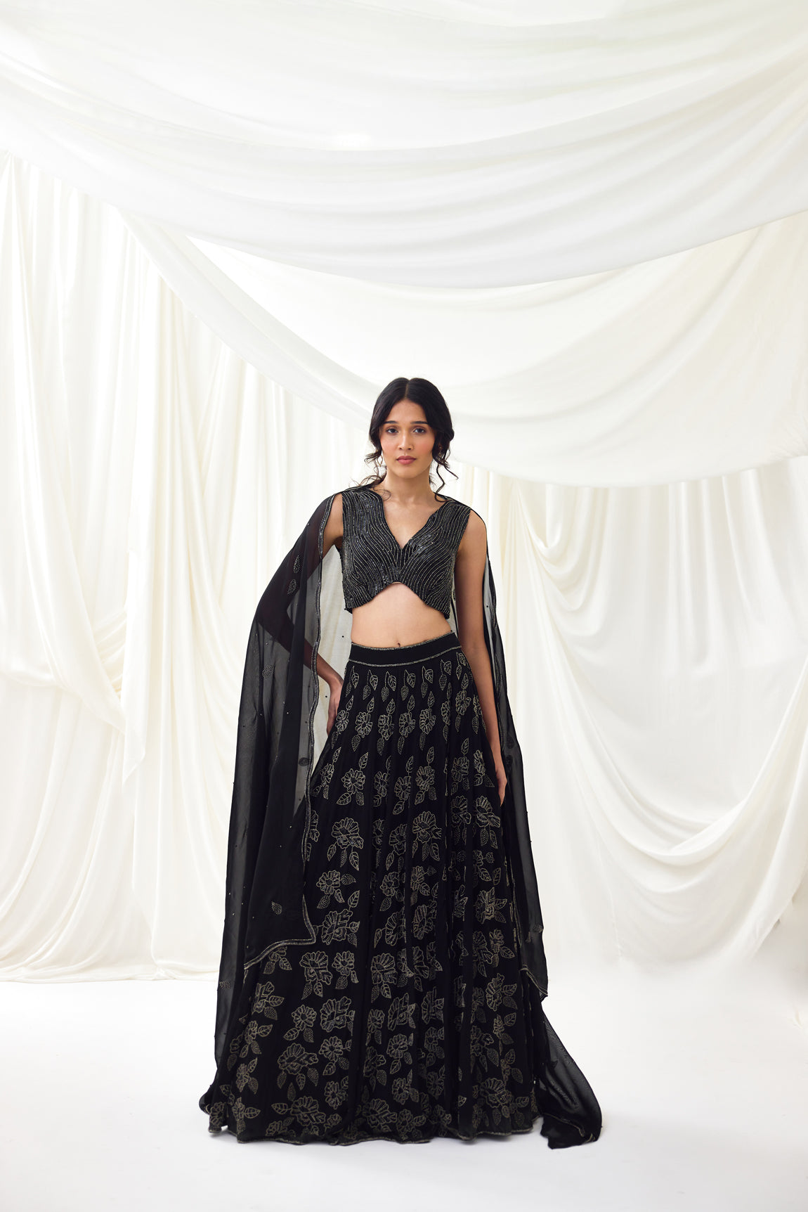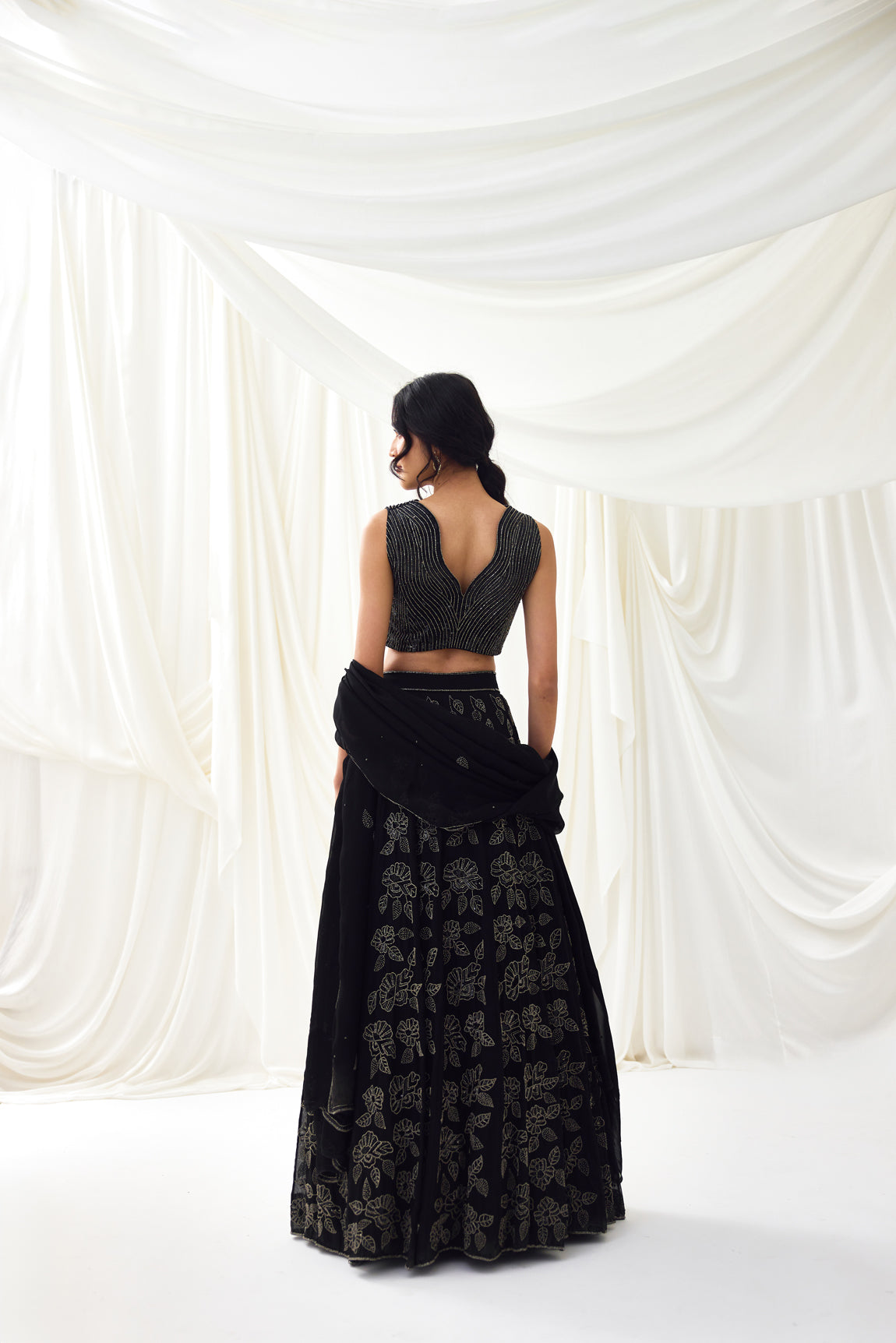Reminiscent of a moonlit garden, this lehenga set features a panelled organza skirt embroidered with sequins and beads in oxidised silver and black.