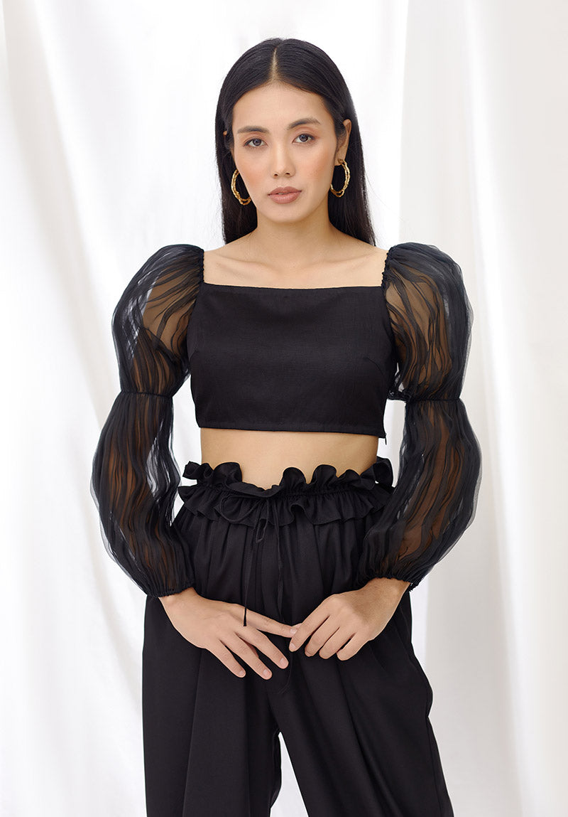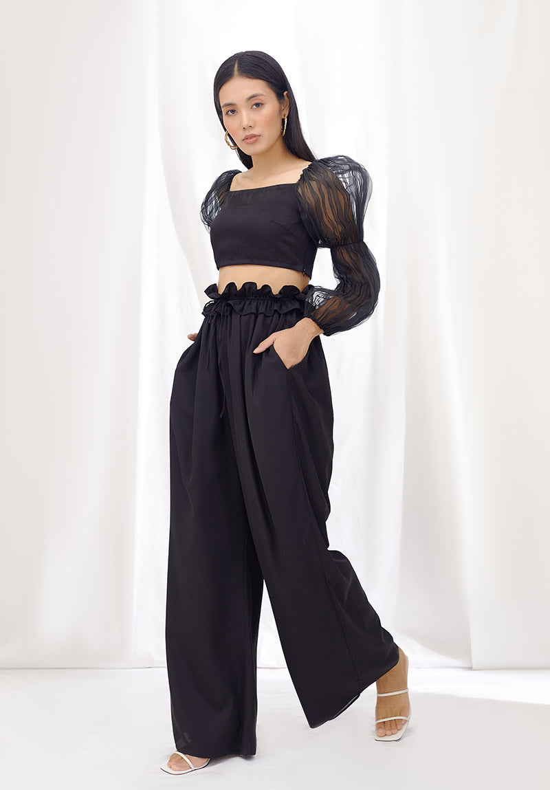 Wide-leg high waisted trousers with a drawstring waist and pockets. Comfortable and versatile, these pants transition seamlessly from day to night. Wear them with our black billow sleeve crop top for an effortlessly chic look that’s high on comfort as well as style.