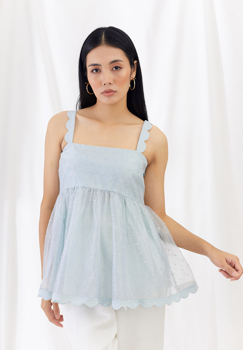 This top features a fitted bodice with a full gathered peplum in dotted organza. It is finished with our signature scallop straps and border.