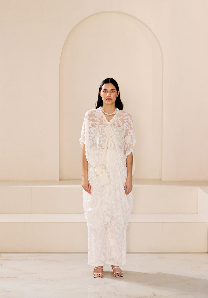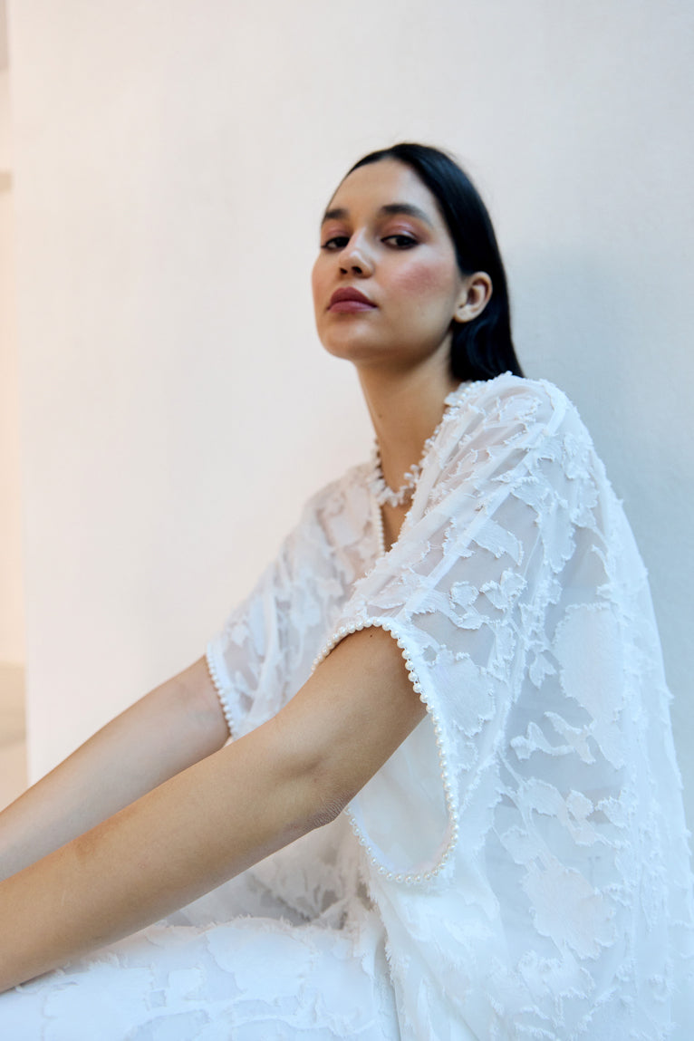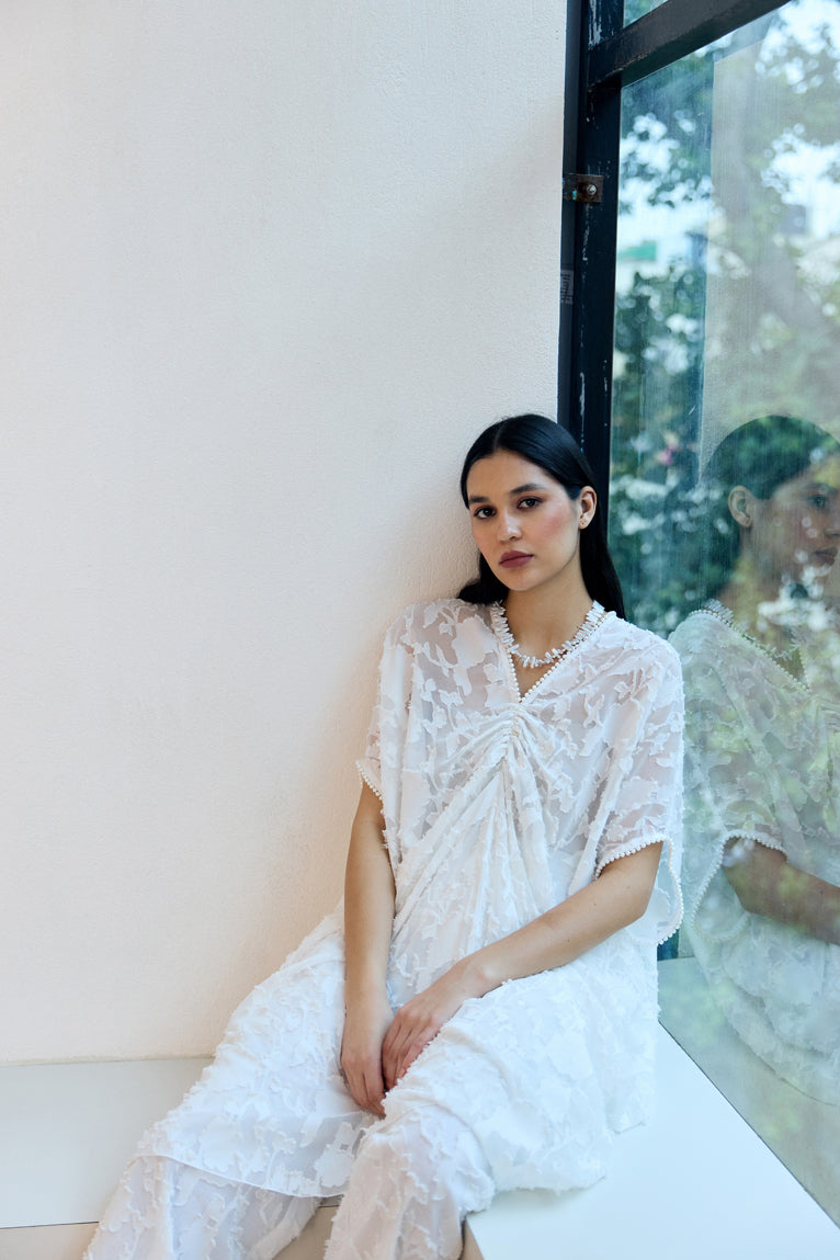 This set includes a kaftan tunic with gathered detailing and matching pants in flowing sheer jacquard.