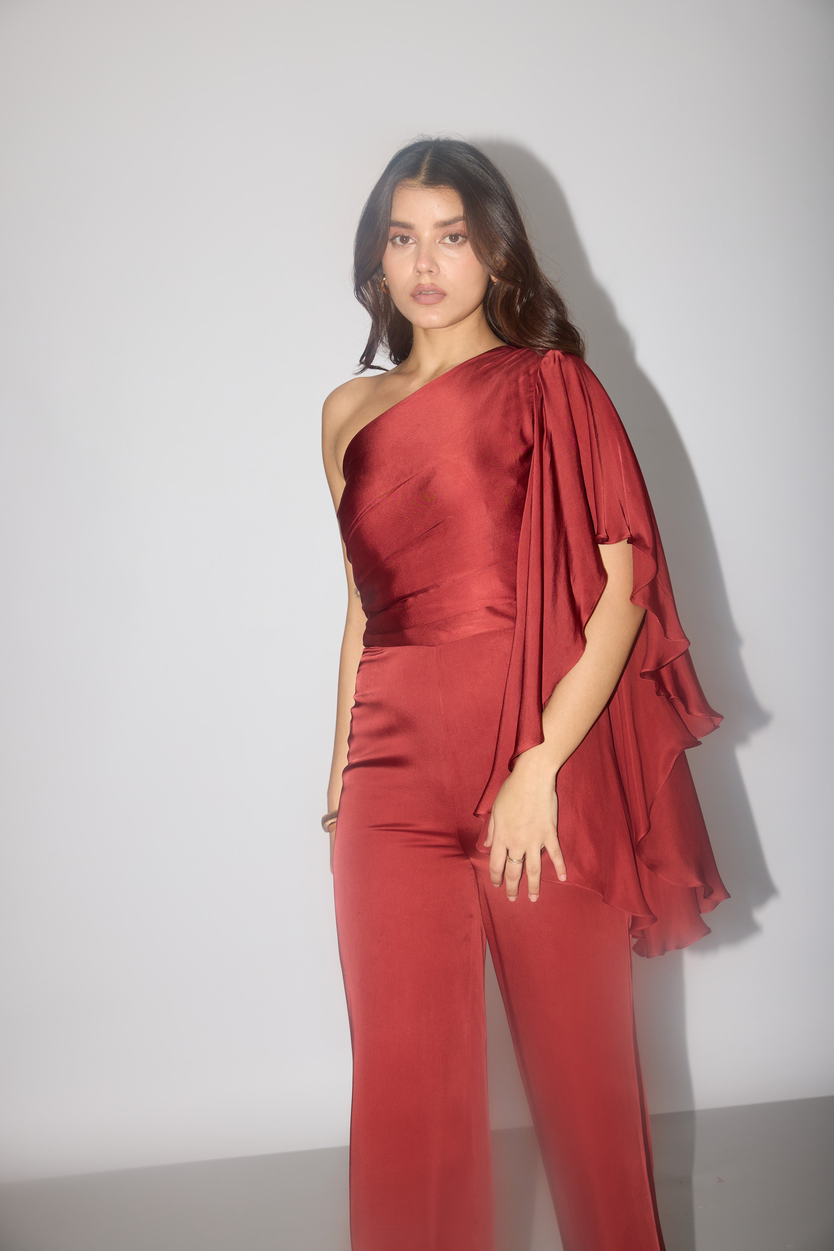 Draped one-shoulder jumpsuit in glossy satin georgette featuring a cascading flared sleeve – ideal for effortlessly chic holiday moments and dressed up evenings alike.