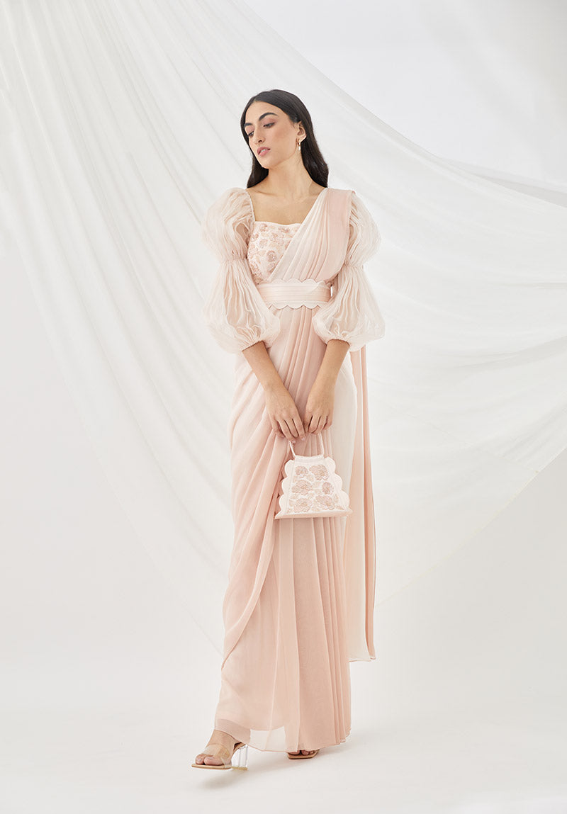 This set includes a pleated wrap skirt with an attached saree drape and a stitched satin petticoat. It comes with an embroidered blouse with billow sleeves in silk organza, and a separate pleated belt featuring our signature scallop trim.