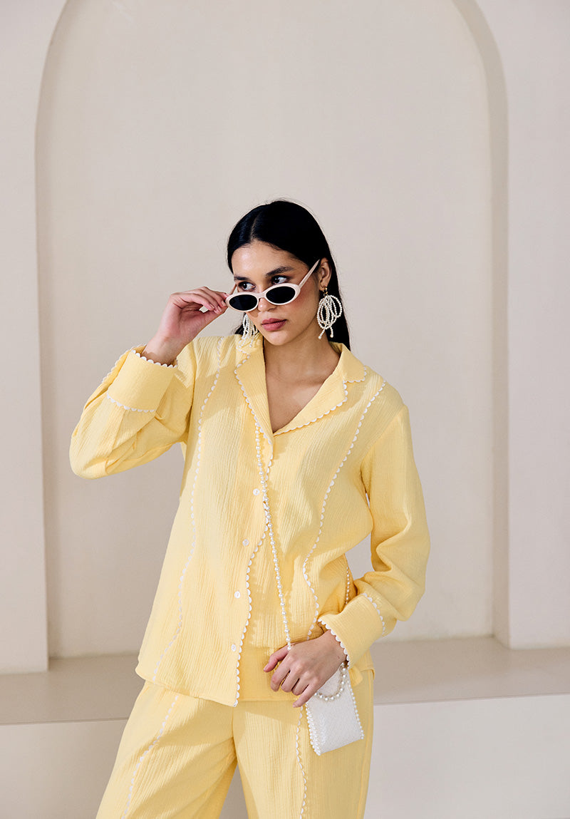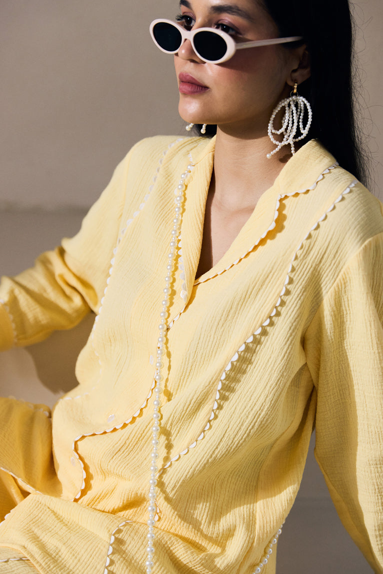 Pair it with matching pants to complete the look. Dress it up with our pearl phone bag and add cute pearl bow earrings for a fun & flirty look.