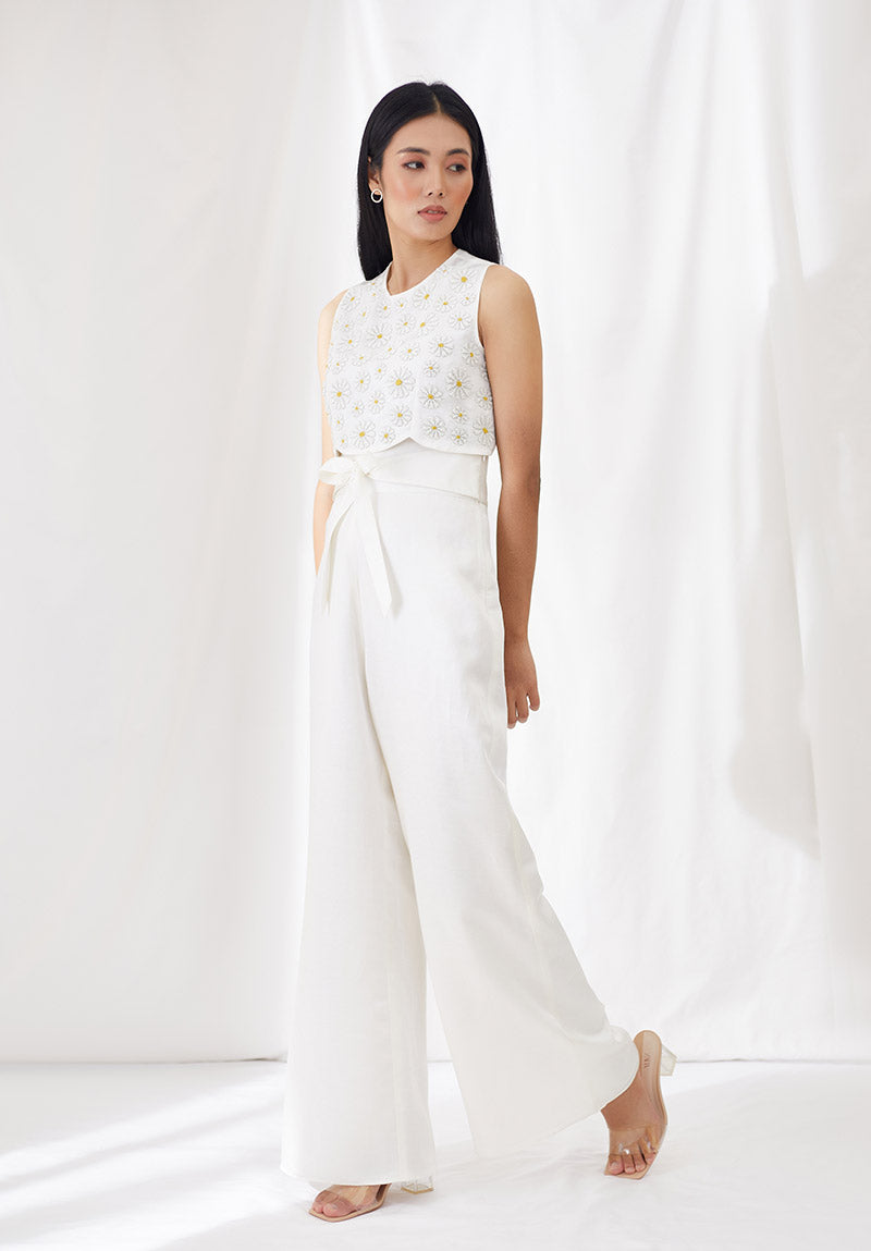 This set includes a daisy beaded top in ivory linen satin with a scalloped waist, beaded front and gathered peplum. It is paired with the ivory tie-detail high waisted pants in linen satin for a fresh and chic summer look.