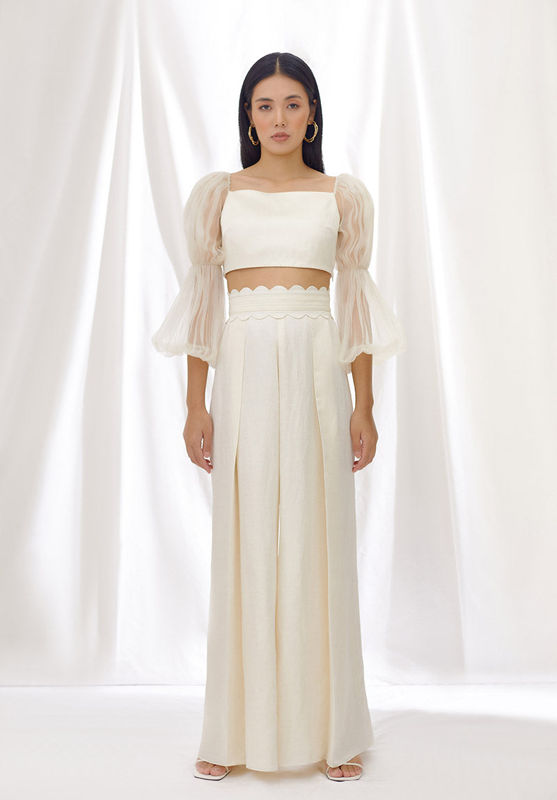 This set includes an ivory crop top with a fitted bodice in linen satin and gathered billow sleeves in silk organza, and ivory pleated pants in linen satin with a wide pleated waistband and our signature scallop trim.