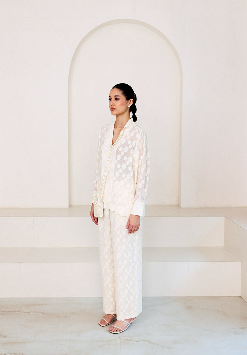 Pair it with our matching jacquard pants to complete the look. Dress it up with our beaded pearl phone bag.