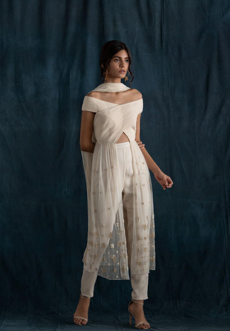 This set features a ruched overlap panel bodice in net, with attached gathered net panels embroidered in gold and ivory glass beads. It comes with satin cigarette pants, and a net dupatta with a beaded scallop border.