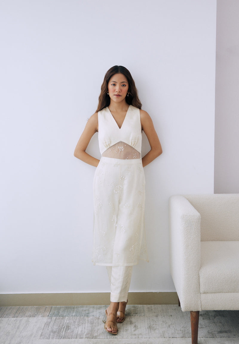 This set includes a long tunic in satin linen and silk organza. It features pleat detailing on the bust and our signature baby’s breath embroidery in ivory sequins and beads.