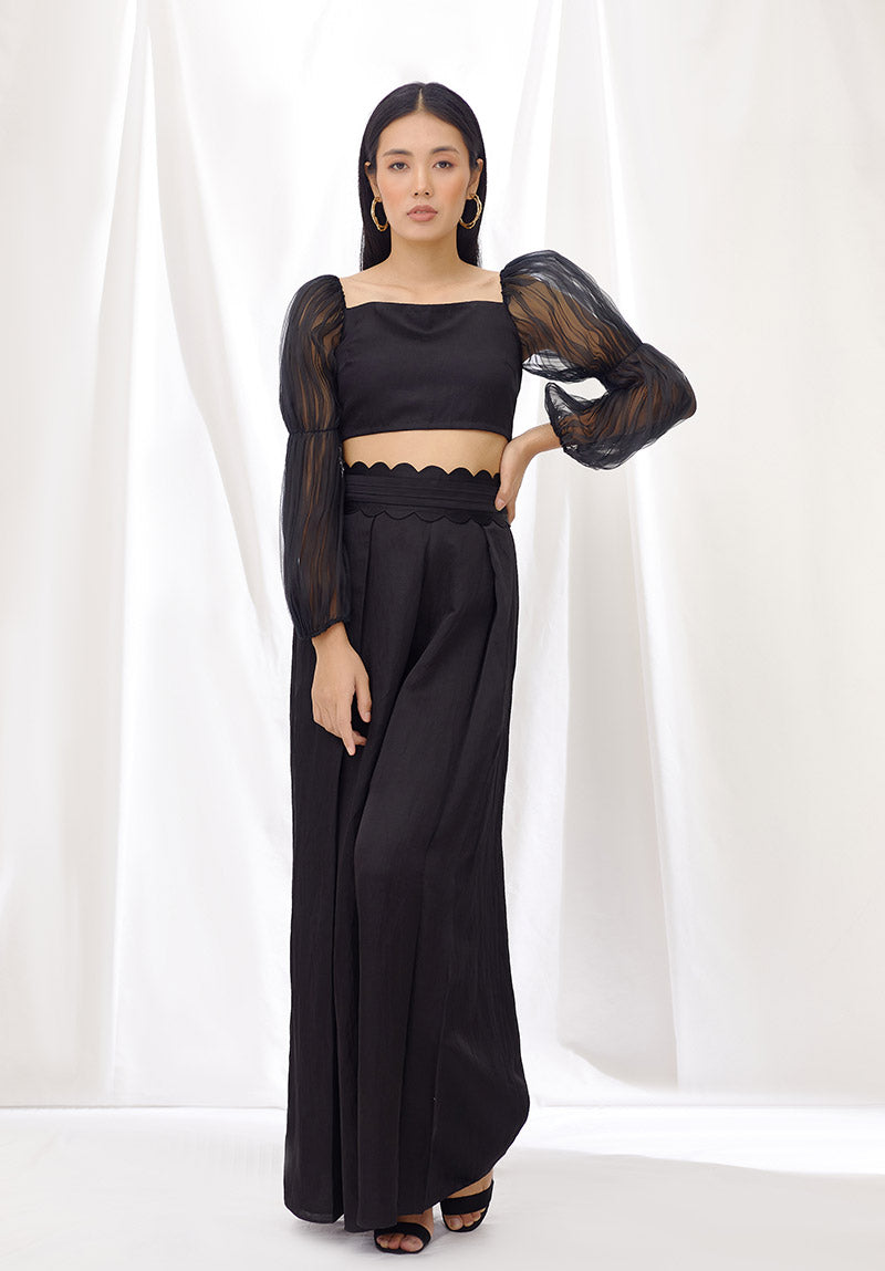 This set includes a black crop top with a fitted bodice in linen satin and gathered billow sleeves in silk organza, and black pleated pants in linen satin with a wide pleated waistband and our signature scallop trim.